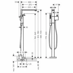 - Consists of: Floor-standing single lever bath mixer, baton hand shower, shower hose, shower holder