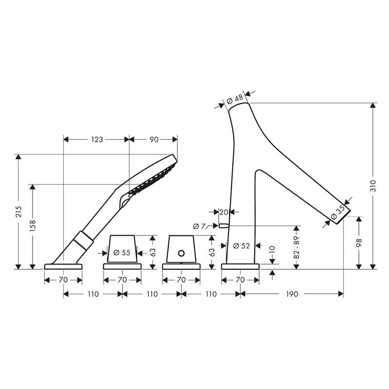 - 4-hole rim-mounted bath mixer, hand shower, shower hose, shower holder