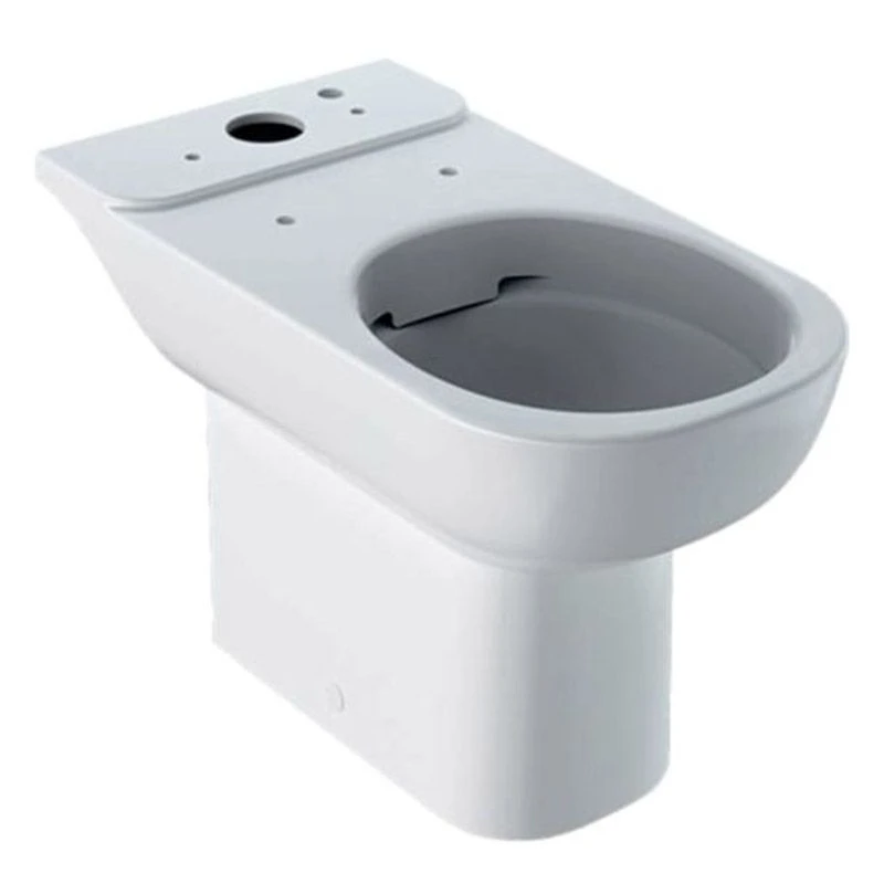The Geberit Smyle floor standing toilet features a multidirectional outlet which can be integrated with a visible or in wall cistern sold separately from Geberit. The connection of the Cistern to the bowl is hidden. This floor standing toilet made from Vitreous China projects out 640mm from the wall.