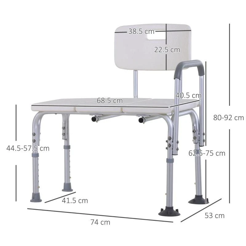 The HOMCOM Height Adjustable Non Slip Bath Transfer Bench with Armrest & Backrest (White) stands as a prime choice for individuals requiring assistance with bathing and showering routines. Its versatility lies in its adjustable seat height that can be tailored to six distinct levels, accommodating diverse user preferences and comfort needs. The spacious seat and overlapping bath design seamlessly facilitate effortless transfers from the seat directly into the bath, promoting a safe and hassle-free bathing experience.