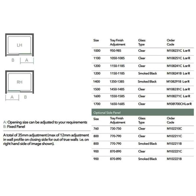 - Adjustment/wetroom min-max with side panel: 1150-1185