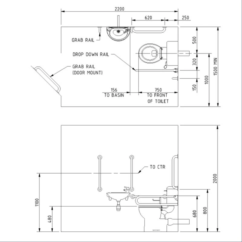 - 5 x 600mm coated steel grab rails with exposed fixings