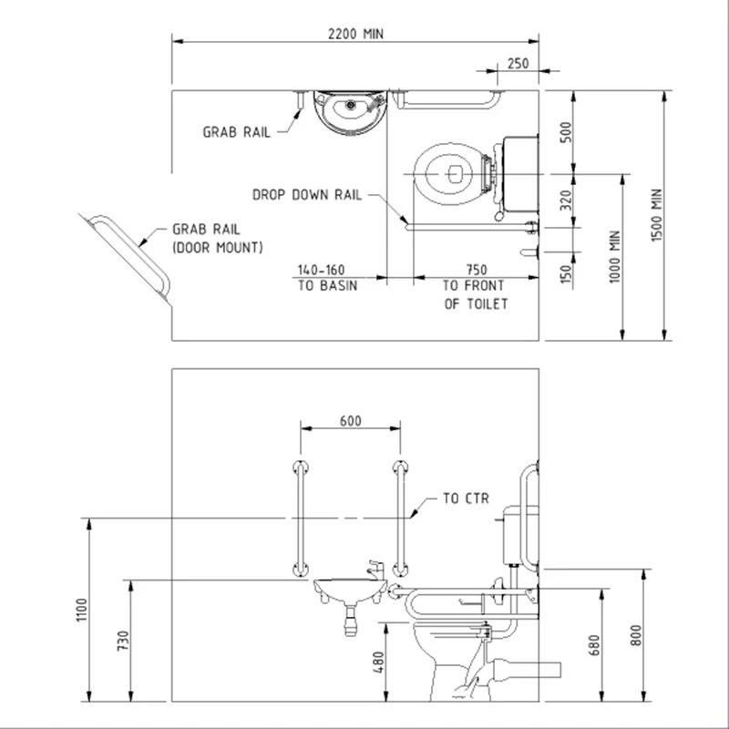 - 5 x 600mm coated steel grab rails with exposed fixings