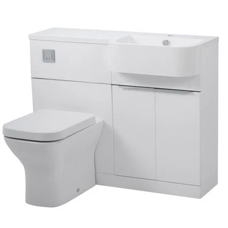 One compact 1 metre unit which can incorporate a 500mm basin unit and a 500mm back to wall pan. Available in a contemporary cross-cut style textured wood finish as well as gloss white, is is set off by touched of chrome on the discreet door handles and toilet panel trim. Installation is very easy, with no cutting required to fit the basin and using the Tavistock Vortex cistern.