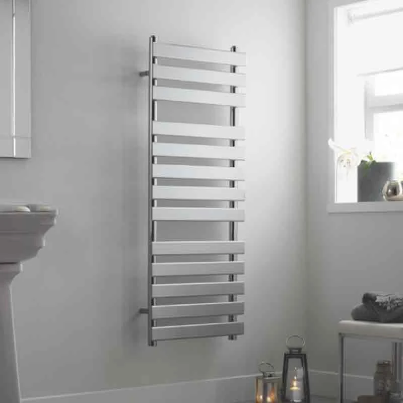 Elevate your bathroom with the Perlo Designer Towel Rail, a fusion of contrasting flat panel horizontal bars and sleek cylindrical vertical bars that create a unique style.