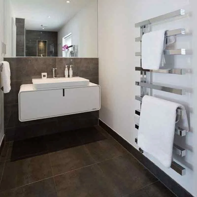 Elevate your bathroom with the towelrads Soho towel rail. Its contemporary design offers both style and practicality, with the flexibility to mount it left or right.