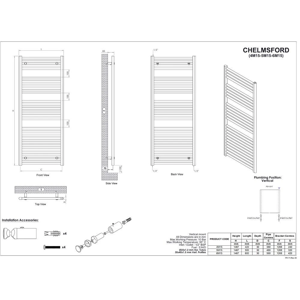 Ultraheat Chelmsford Straight Towel Radiator 1467x600mm – White – 6M15W Details
