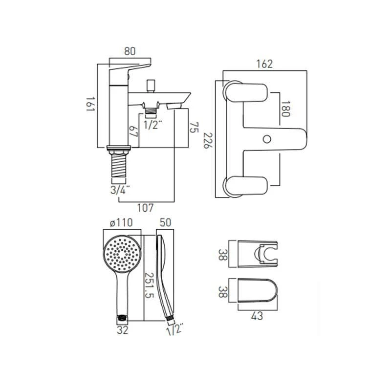 Vado Photon 2 Hole Bath Shower Mixer Deck Mounted With Shower Kit – Chrome – Details